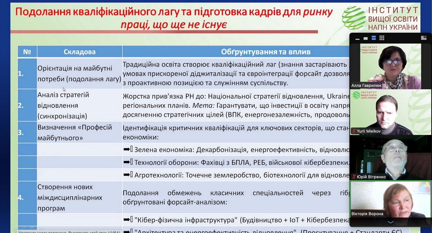 30 жовтня 2025 року науковцями Інституту вищої освіти НАПН України проведено семінар на тему «Інноваційний розвиток сучасного університету: синергія трансформацій вищої освіти, науки, економіки та суспільства». Співробітники відділу соціальних та інституційних трансформацій у вищій освіті Інституту Ю. О. Мєлков, А. М. Гаврилюк, Ю. М. Вітренко та В. О. Ворона презентували своє бачення інноваційних тенденцій розвитку університетів, спрямованих на забезпечення відповідності сучасної системи вищої освіти сьогоденному рівню науки, економіки та суспільства в цілому. У роботі семінару взяли участь наукові, науково-педагогічні працівники та здобувачі вищої освіти з різних закладів освіти України, в тому числу з Криворізького національного університету, Білоцерківського національного аграрного університету, Вінницького державного педагогічного університету імені Михайла Коцюбинського, Міжрегіональної академії управління персоналом та ін.