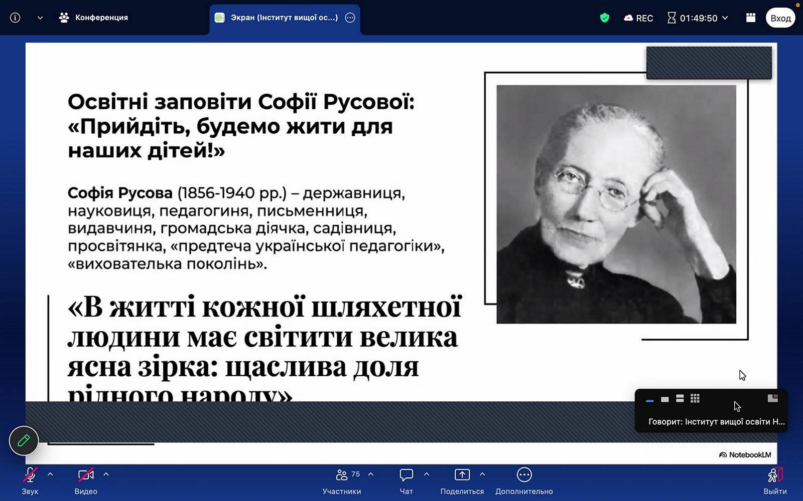 30 березня 2026 року в рамках плану заходів Національної академії педагогічних наук України щодо проголошення 2026 року – Роком Софії Русової та в межах реалізації Концепції громадянської освіти в Україні на 2024-2030 рр. в Інституті вищої освіти НАПН України відбувся культурно-просвітницький захід на тему