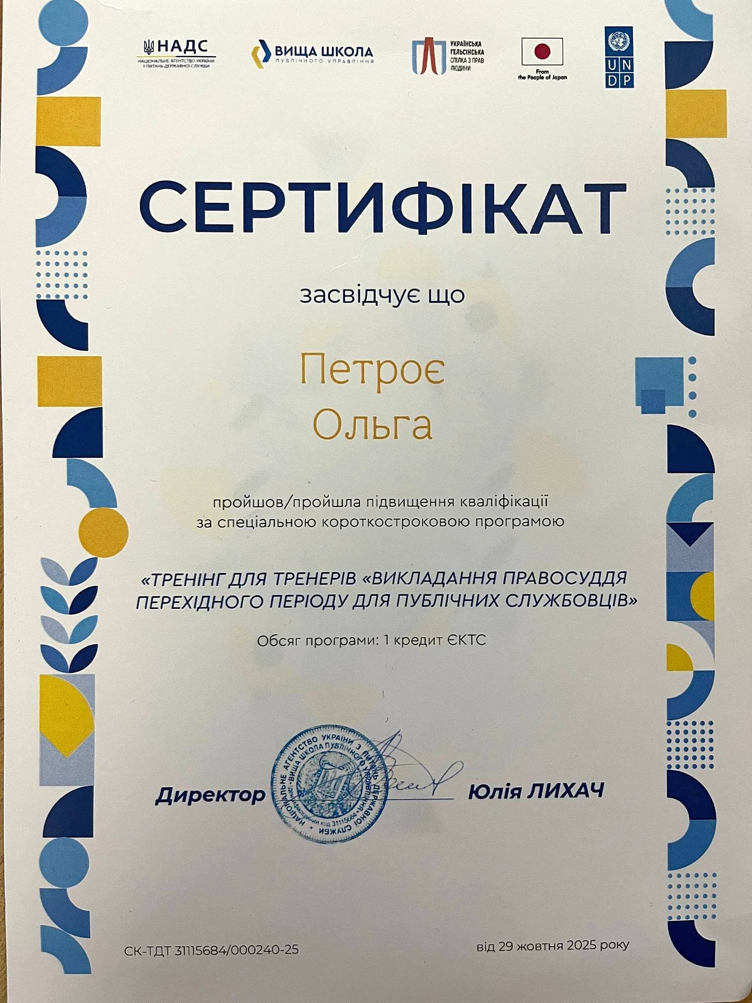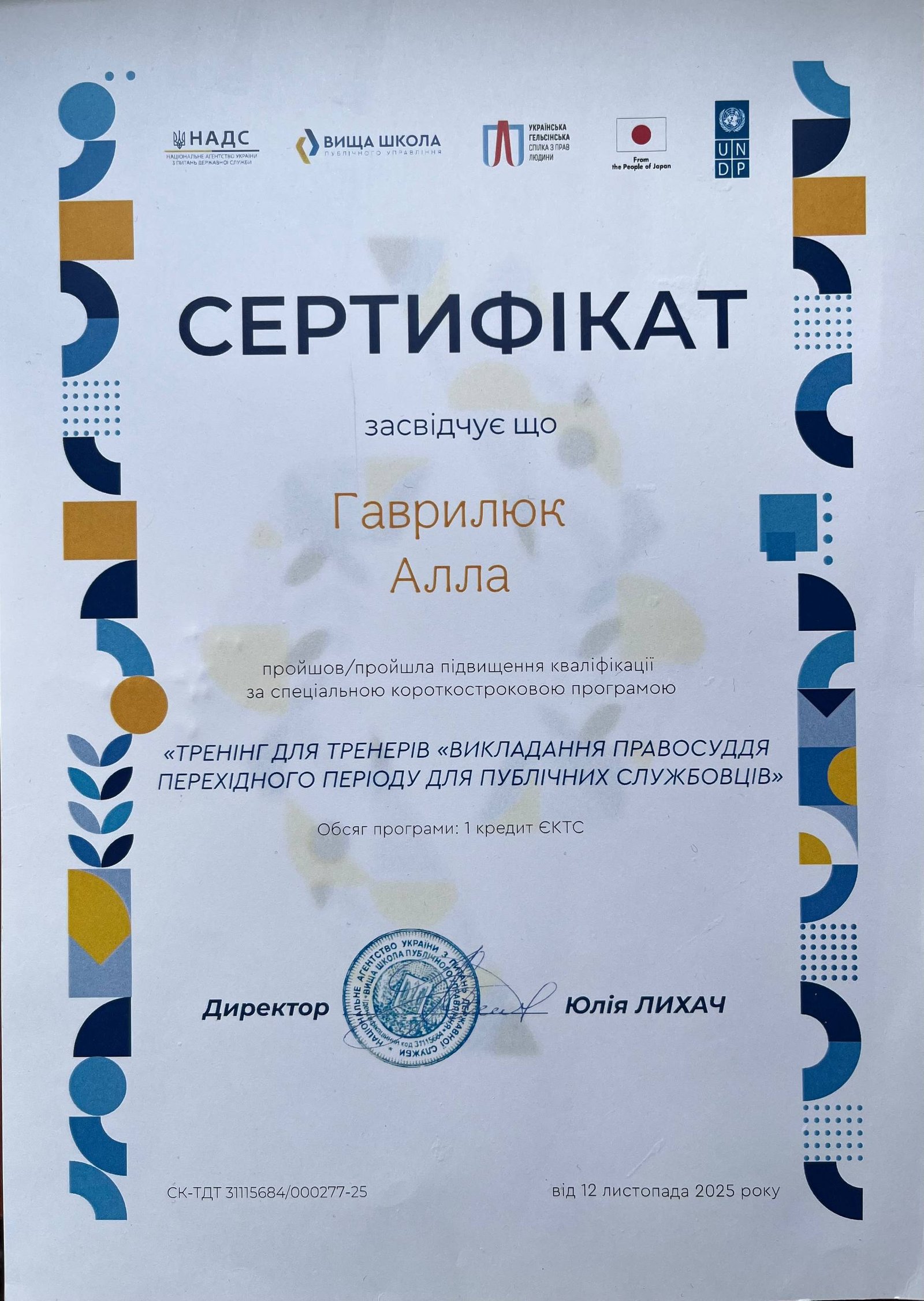 Вітаємо наших колег з отриманням сертифікатів про підвищення кваліфікації за короткостроковою програмою «Тренінг для тренерів «Викладання правосуддя перехідного періоду для публічних службовців».