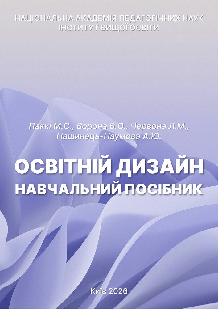 Освітній дизайн: навчальний посібник. Паккі М.С., Ворона В.О., Червона Л.М., Нашинець-Наумова А.Ю.; за ред. В. Ворони. Київ: Інститут вищої освіти НАПН України, 2026. 184 с.